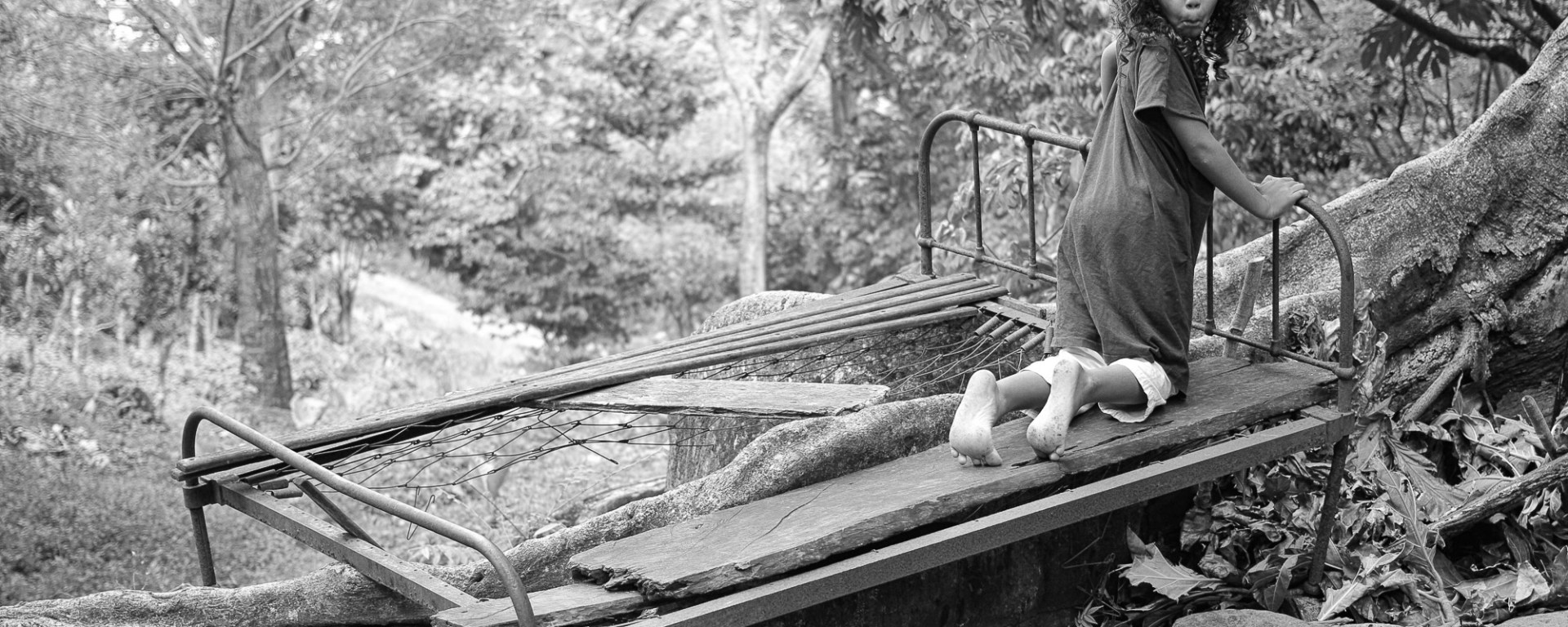 Drôle d’impression en découvrant cette photo en 2020.. A l’heure où les papiers peints motif « jungle » fleurissent dans les foyers occidentaux. On pourrait croire au premier coup d’œil intercepter la bref réaction de stupeur d’un enfant pris sur le fait de son insoumission au sommeil.