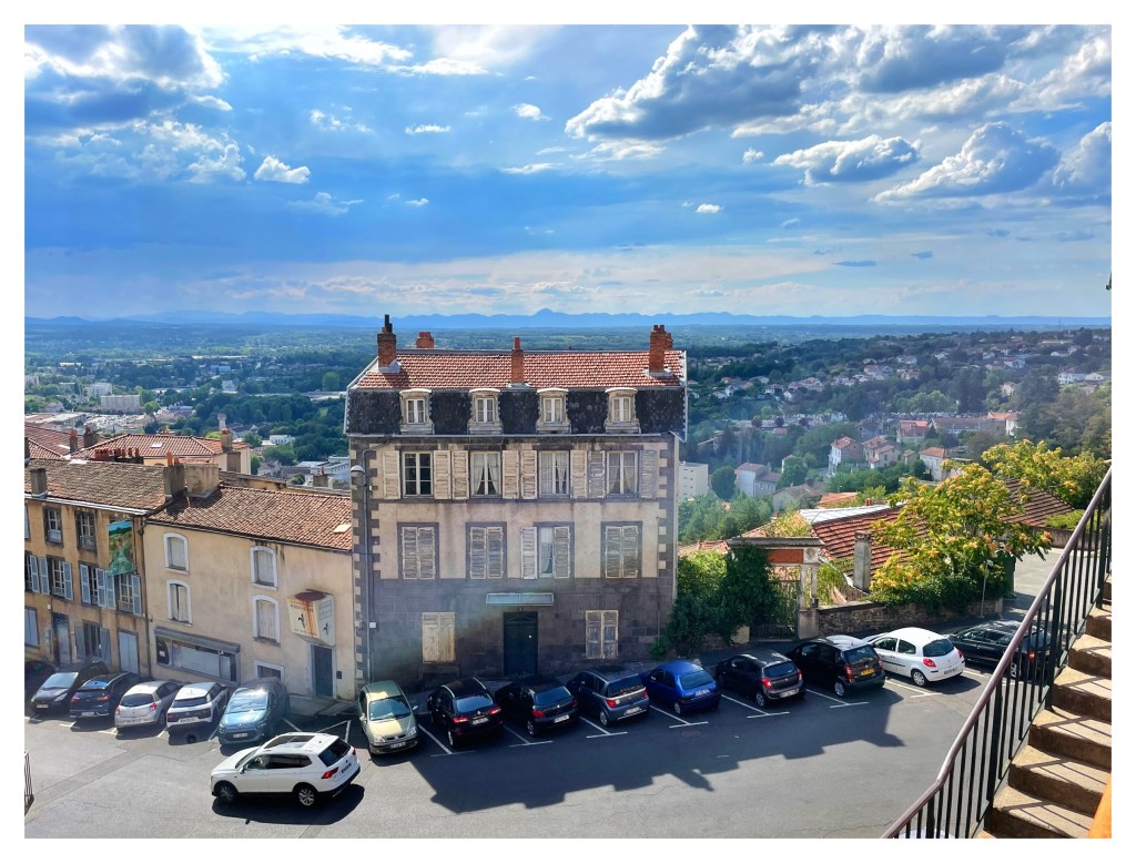 Vieille bâtisse, ciel plombé, ligne de crêtes, escalier en coin… mais aurez vous remarqué que toutes les voitures à l’ombre sont de couleur sombre et stationnées dans le même sens ? (Thiers, 08/22)
