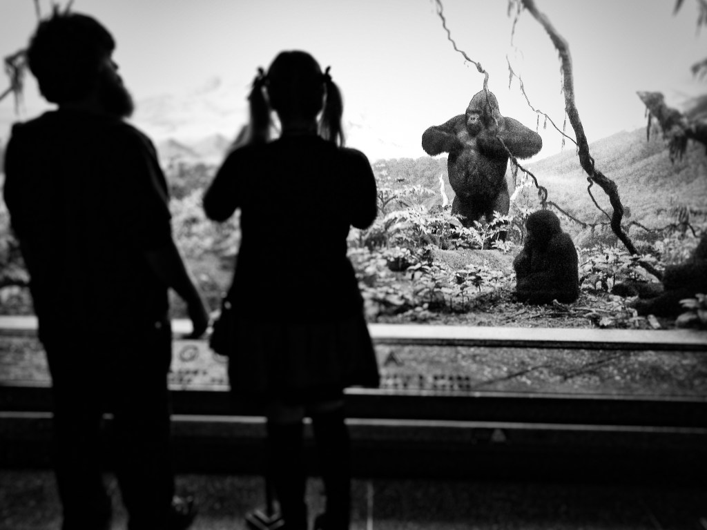 Sur cette photo, il est légitime de se demander qui dévisage l’autre. Est-ce le primate qui regarde l’homme vêtu ou l’homme qui observe le primate nu ? N’oublions pas non plus le Photographe qui regarde la scène et son plus simple appareil.