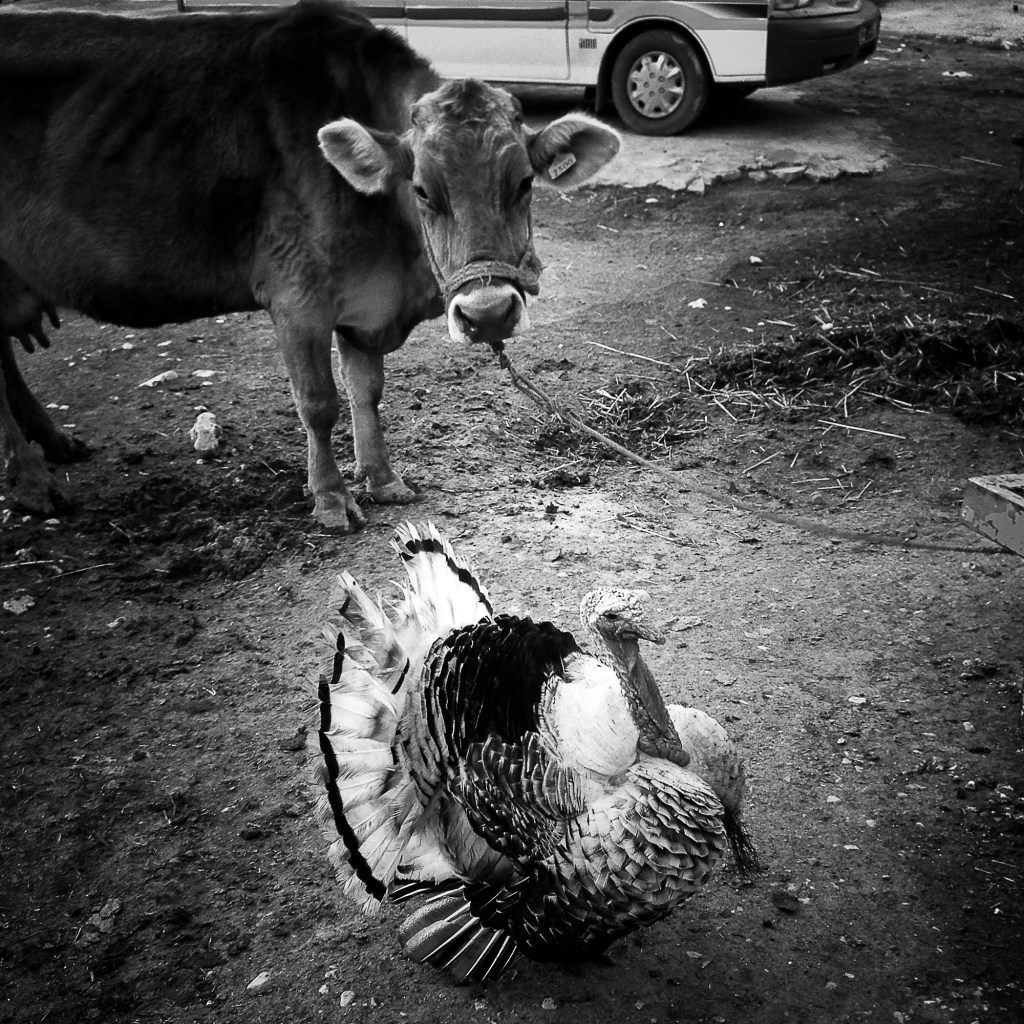 Ce couple d’animal cohabite aisément. Pendant que le dindon glougloute pour faire un bœuf, le bœuf rumine le voyant ainsi passé. On dit fort comme un bœuf mais le dindon ne veut pas être celui de la farce.