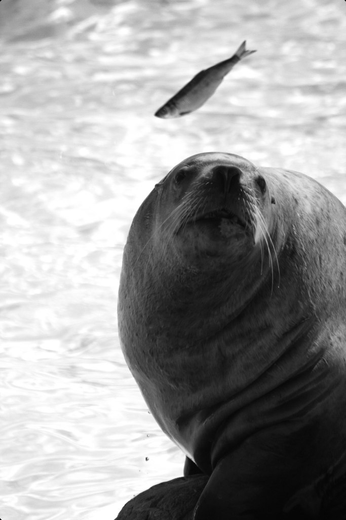 L’otarie est joueuse et aime jongler, ce qui en faisait un animal de cirque. Son regard attendrissant lui permet d’être, réjouissons-nous, mieux protégée de l’homme. Concernant le poisson, qui lui est donné en pâture, il faut bien avouer que tout le monde se moque de son existence et l’abrège ainsi sans aucune émotion. Sans doute est-ce une question de regard…